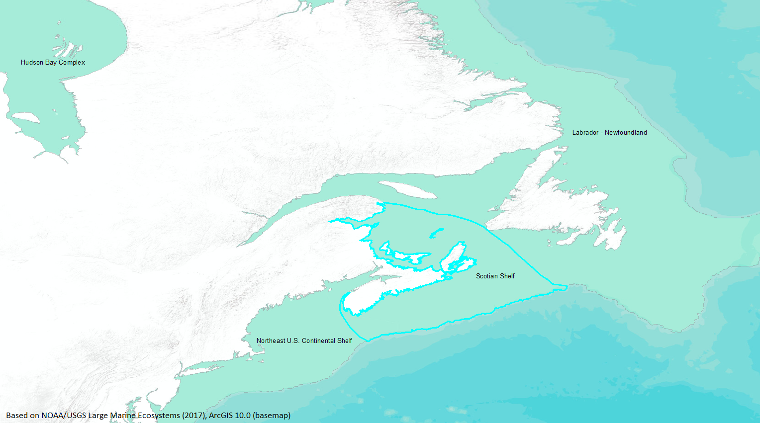 Surrounding Nova Scotia is the Scotian Shelf LME, an area that extends to the shelf break, more than 200 nautical miles (nm) from the Canadian coast at some points. As it is a region divided between high seas law and national jurisdiction of two countries (France and Canada), management of its resources will involve additional complexities. Currently, its main fisheries (cod, haddock, flounder, and other demersal fish) are overexploited, but a management scheme taking into account species interaction and biomass production is being initiated (http://www.na.nmfs.gov/lme/text/lme8.htm). |